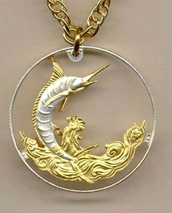 Bahamas 50 Cent "Blue Marlin" Two Tone Coin Cut Out with 24" Chain Product Description: