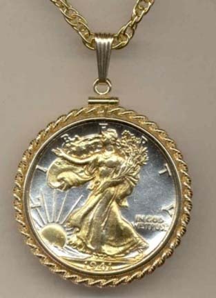Walking Liberty Half Dollar (1916 - 1947) Two Tone Rope Bezel U.S. Coin with 24" Chain Product Description: