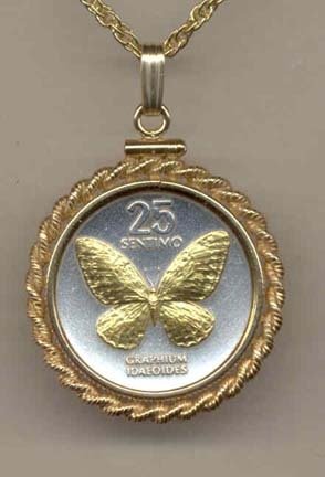 Philippines 25 Sentimos ÒButterflyÒ Two Tone Gold Filled Rope Bezel Coin on 18" Necklace Product Description: