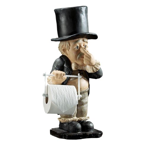Amuse your guests with this whimsical item that also helps with bathroom organization. The tissue holder features a dutiful butler who offers one roll of tissue in his hand and stores another in his hat. This lighthearted bath item is a conversation piece and promises to be the most talked about of all of your bathroom organization accessories! Made from handpainted resin, this unique piece of bath decor depicts a loyal butler with a hilariously caricatured face. And with a simple color scheme that coordinates with almost any decor, this toilet paper holder is a perfect addition to your bathroom. Actual size is 23"Hx10.5"W
