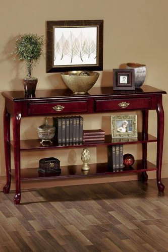 With functional features that meet today's needs, this elegant piece of living room furniture features delicate styling and rich hardwood and hardwood veneer at a modest price. Our beautiful console table offers sophisticated style at a price you can afford.Our console tables are not just beautiful, they are versatile, too. Use this elegant piece as an entry way table to welcome guests into your home, or add it to your living room for additional storage and Old-world style. Sure to become an instant heirloom, this unique piece features a beautiful finish that is sure to enhance any decor. Order yours now. Actual size is 47"W