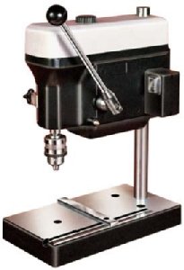 Microlux Drill Press - A precision miniature drill press for labs, electronics, jewelry and model work. 5" x 9" cast aluminum table base and housing machined surface. Three-speed belt drive, 2100, 4500, 6500 RPM. Ball bearing spindle with 1-1/4" travel. Three-jaw chuck and key, .028" to 1/4" capacity. Sliding gauge for drilling in-line holes. 3/4" plated column; calibrated depth control. Adj. chuck-to-table distance, 0" to 6". 110 volt AC high torque motor.